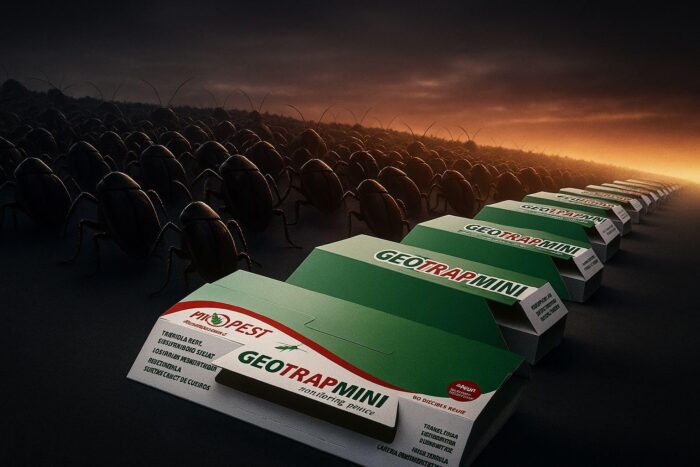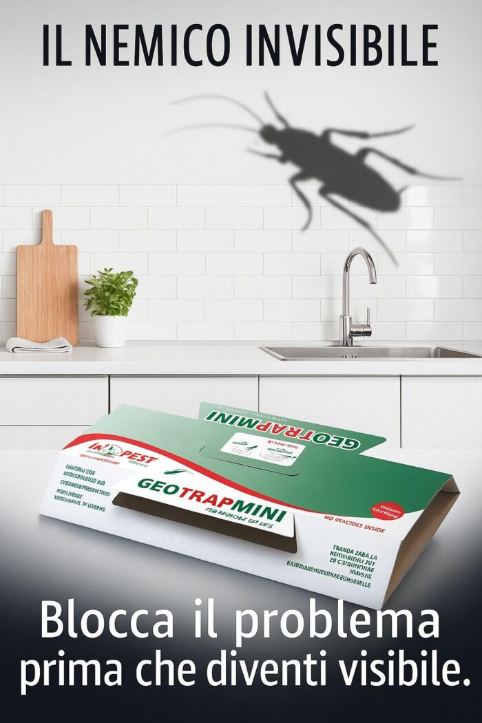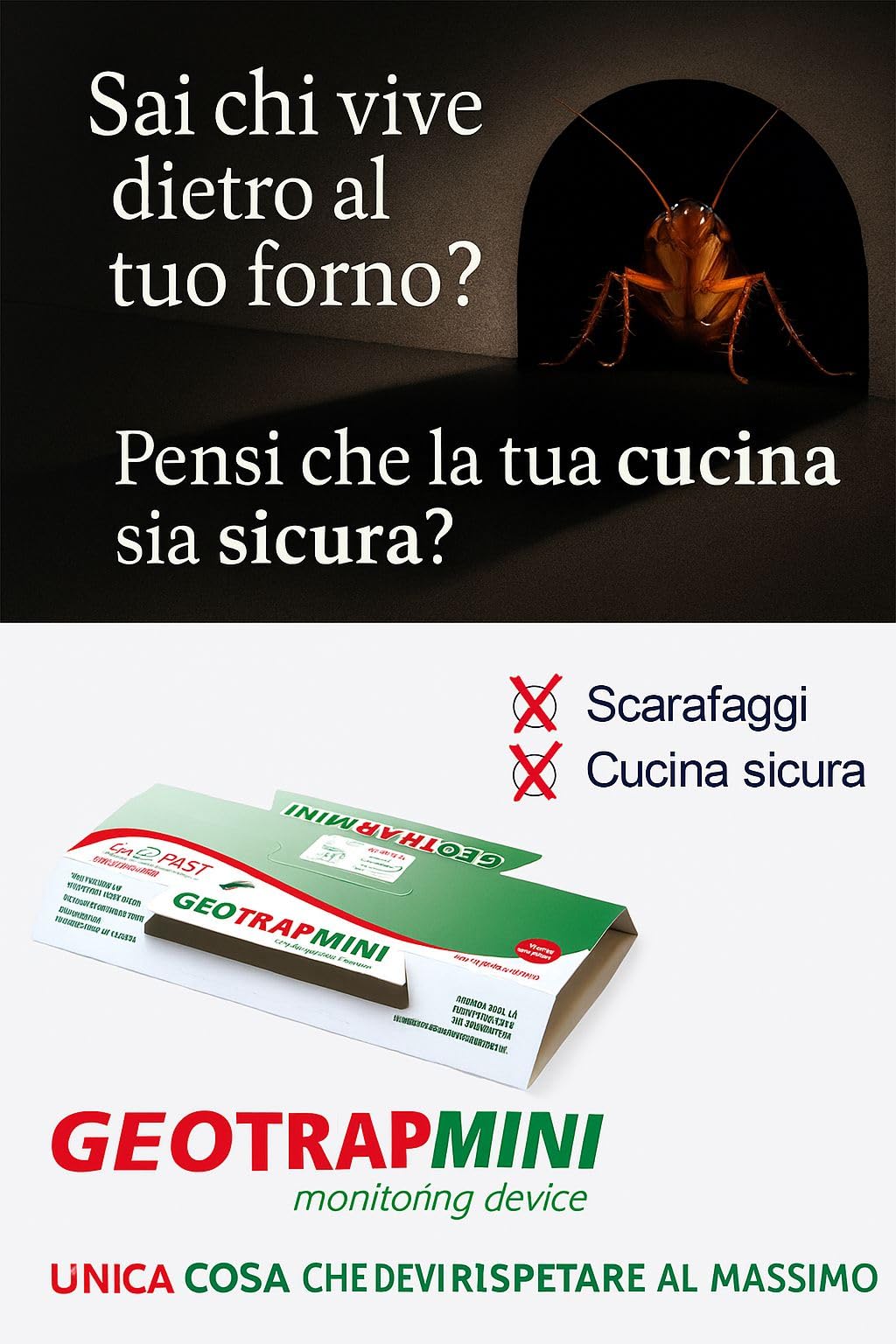 Geotrap Trappola Adesiva Insetti è un Dispositivo di controllo aromatizzato alla liquirizia per il monitoraggio di insetti striscianti quali: Blattella germanica (Blattella grigia o scarafaggio delle cucine, degli ospedali, etc.), Blatta orientalis (Blatta nera o scarafaggio nero delle vecchie abitazioni), Periplaneta americana (Blatta rossa) e Supella longipalpa. Monitoring device utile all’applicazione dell’IPM secondo norma UNI EN 16636: 2015, da impiegare per mantenere una regolare sorveglianza degli infestanti presenti in un determinato ambiente per un periodo di tempo definito. Quindi è un sistema ecologico per la CATTURA e il MONITORAGGIO di blatte, senza l’impiego di sostanze tossiche. E’ preattivata con Gel attrattivo spalmato sulla superficie con aroma alla liquirizia ed un efficacia di 60 giorni.